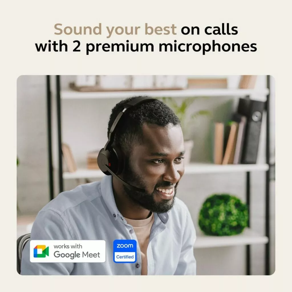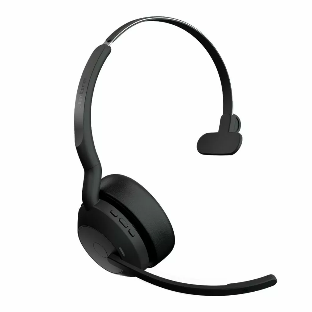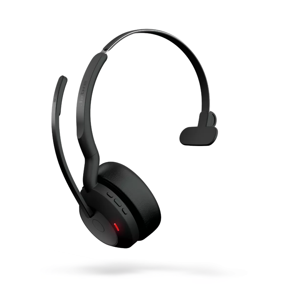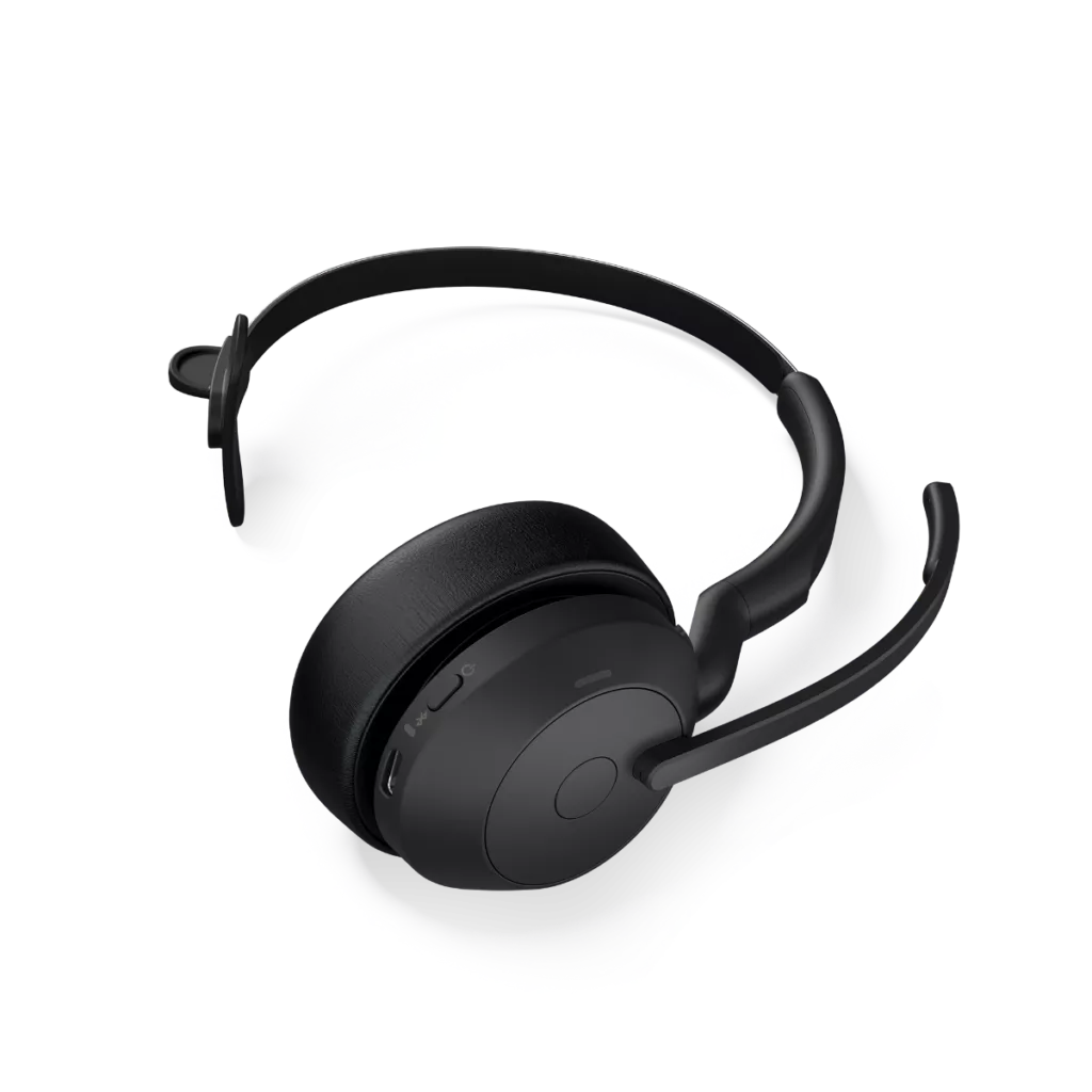 The Jabra Evolve2 55 combines premium performance with lightweight portability and surprisingly powerful voice pickup. With a long microphone boom and Jabra ClearVoice technology, the four-microphone beamforming system (three for mono) is Microsoft Open Office Certified, meaning it’s met the strict Microsoft noise cancelling standards to deliver top-notch voice clarity, and ensure that your clients and colleagues only hear you, not the background noise.