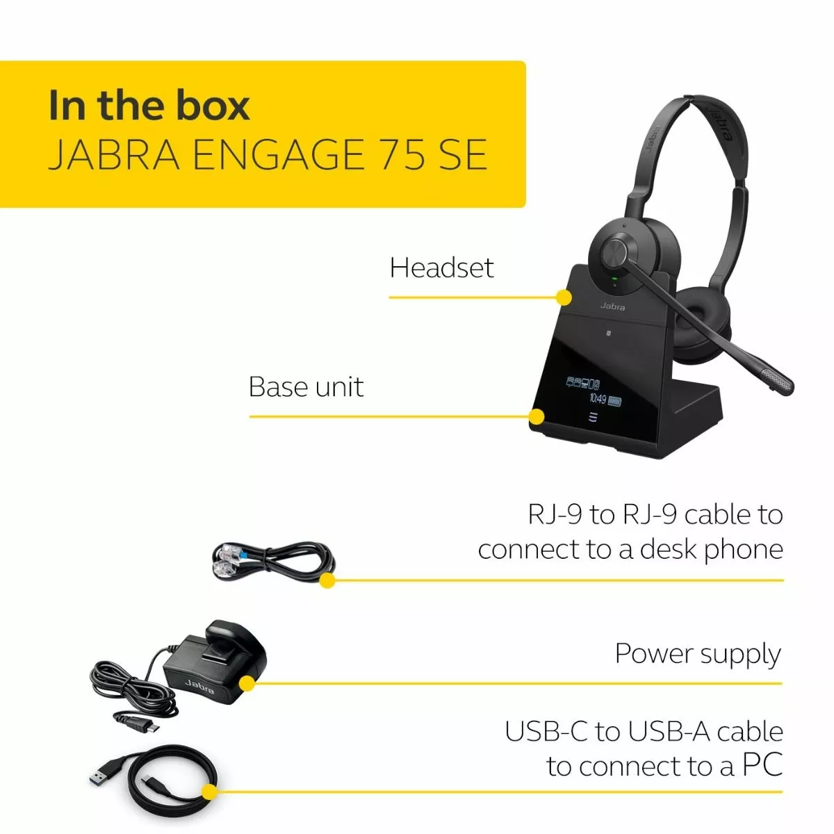 NB: The new Jabra Engage 75 SE base units and desk charging stands have been upgraded from Micro-USB to USB-C ports. This means second edition (SE) Engage 75 headsets are not compatible with first edition Engage 75 base units or desk charging stands.