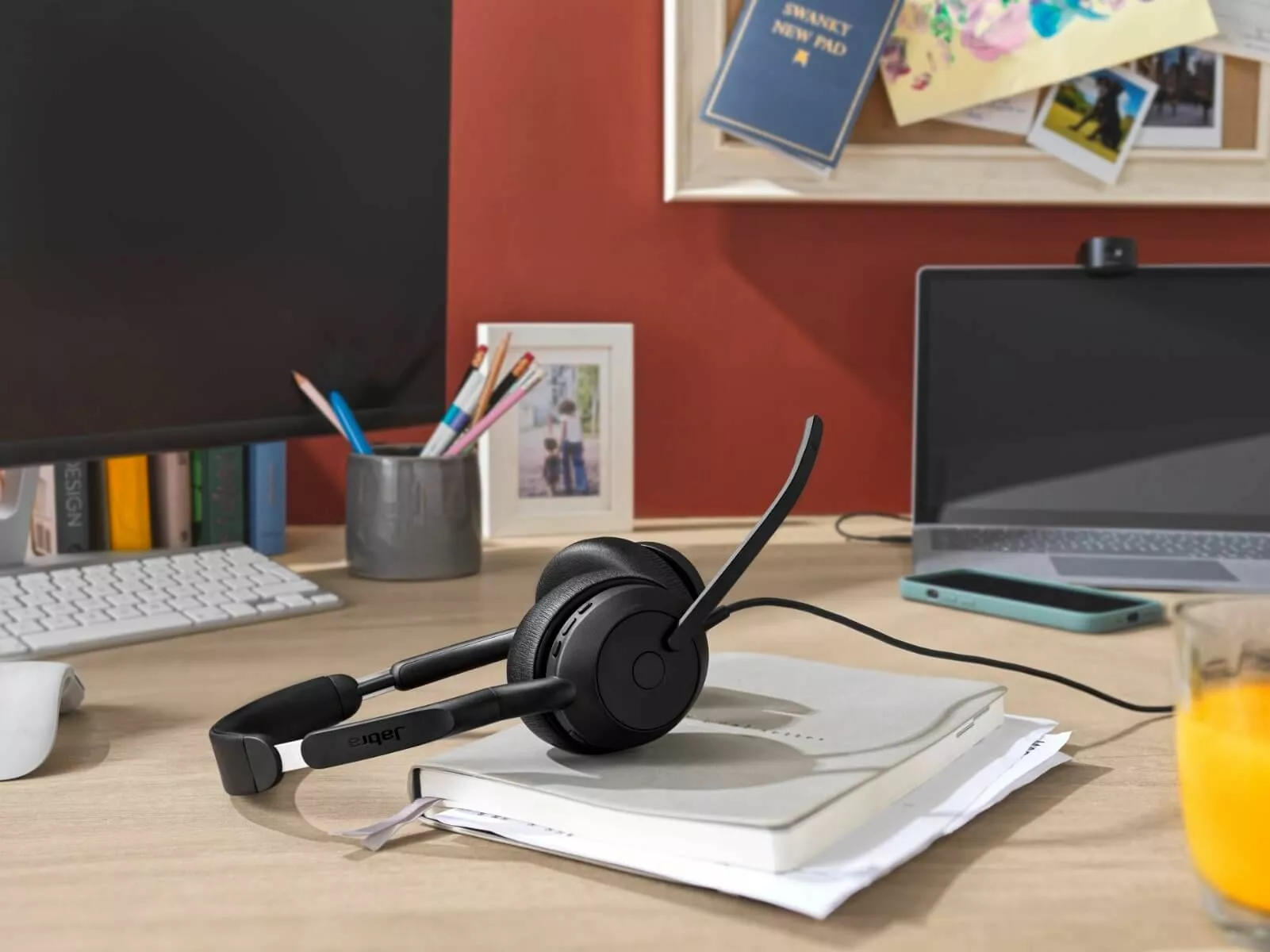 When it comes to controls, Jabra keeps it intuitive. Lower the boom arm to answer, raise it to mute – no more fumbling. It also includes on-ear volume, playback, and call controls. The headset folds flat into a soft travel pouch, making it perfect for hybrid workers who move between home and the office.