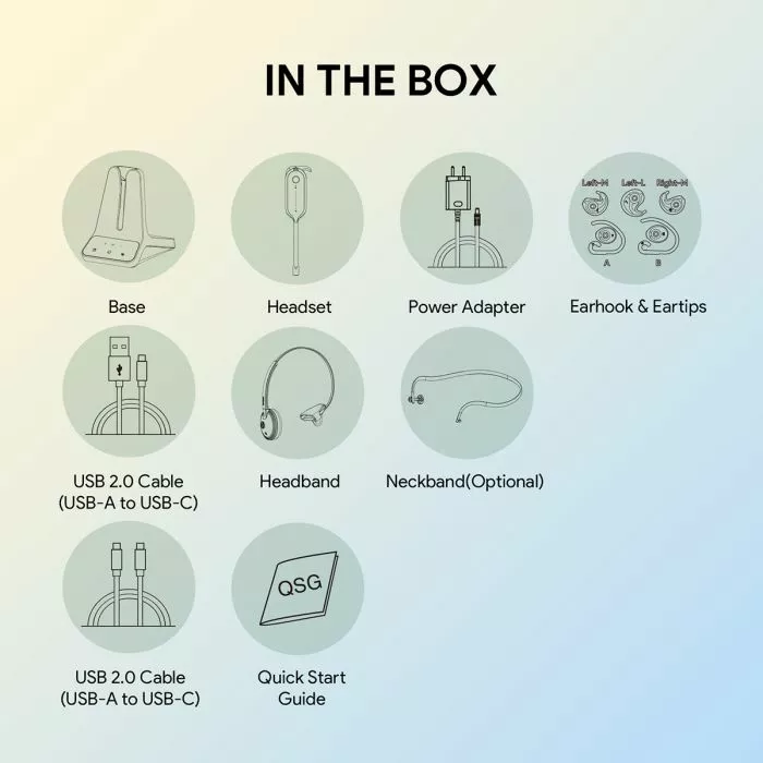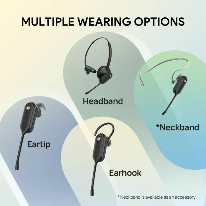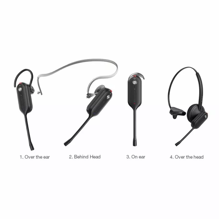 The Yealink WH63 E2 wireless headset comes with four accessories: shark fin eartips, earhooks, headbands, and neckbands*. Each accessory has been designed based on research involving nearly a thousand users to meet the highest ergonomic standards.