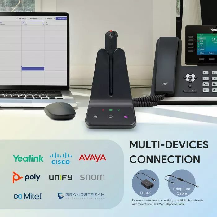 The WH63 E2 supports multi-device connectivity, allowing simultaneous telephone and PC connections. It enables control over call status on different devices and supports mixed-mode conferencing for quicker online meetings. This facilitates multi-party communication and offers a more efficient and convenient work mode.