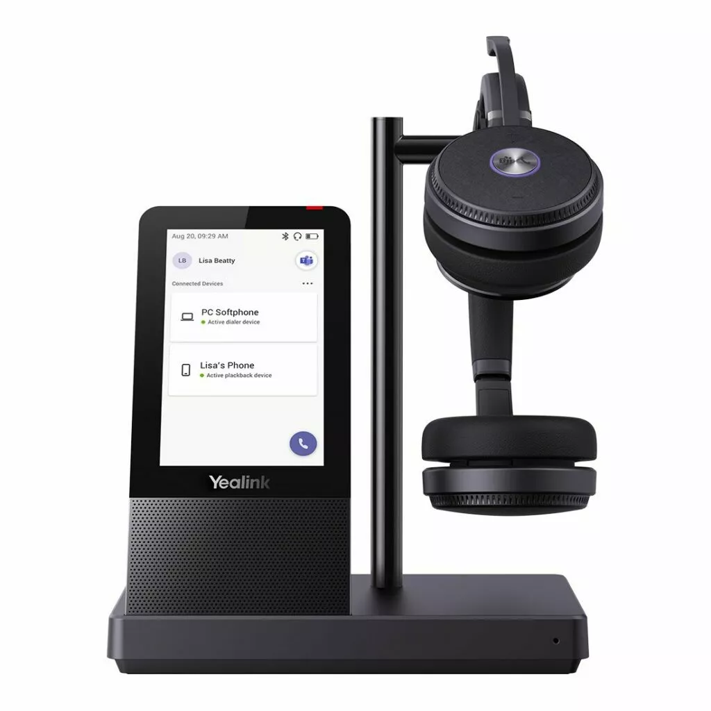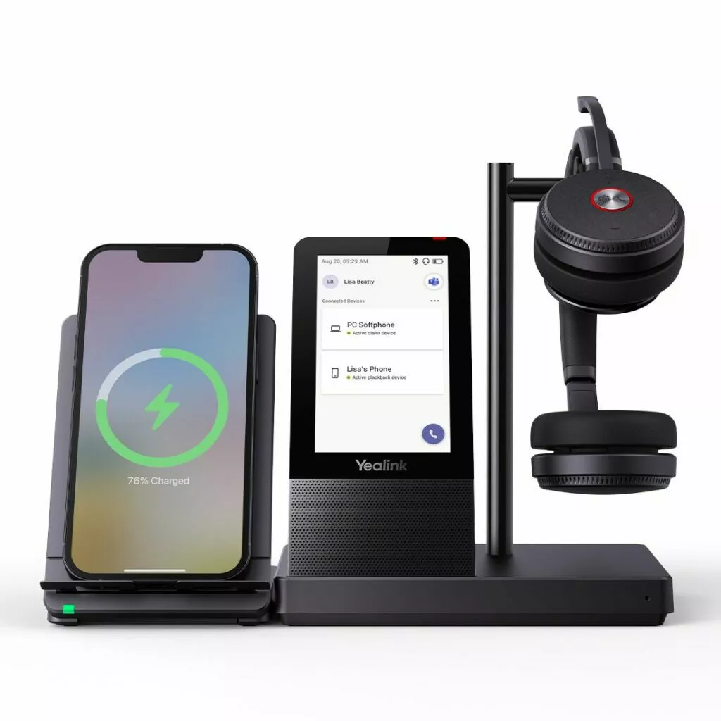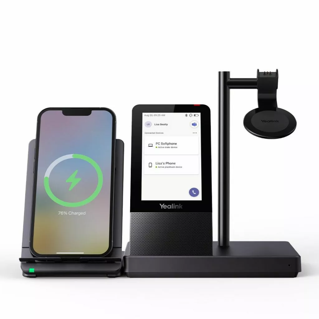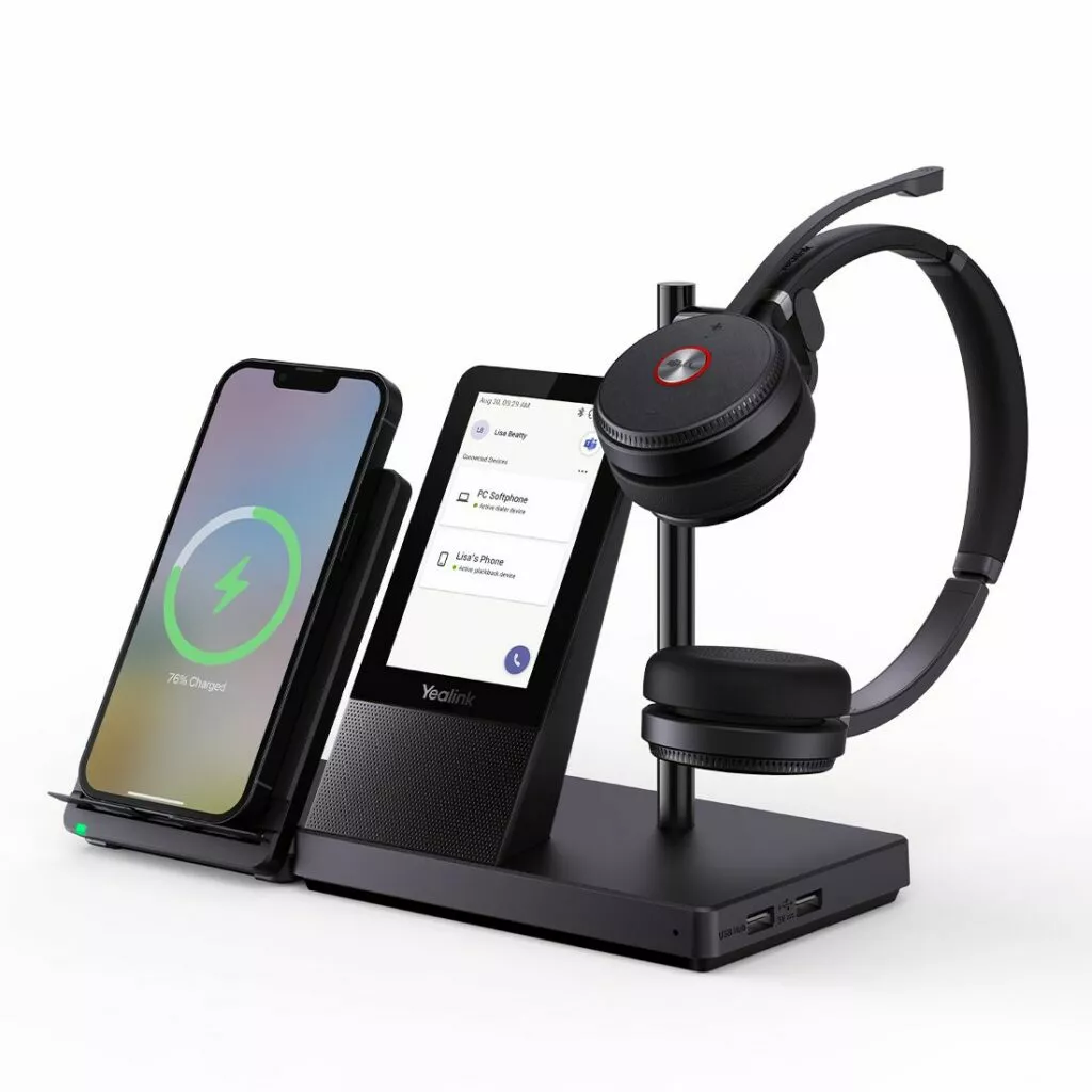 The Yealink WH66 Dual DECT Wireless Headset UC Workstation gives users the possibility and flexibility to connect devices and manage communications from a single device. It also acts as a hub that integrates a full-duplex speakerphone, a wireless charging mobile phone stand, a 4-inch touch console and a USB hub, which together offer an incredible set of features allowing you to meet, connect and collaborate seamlessly and intelligently.